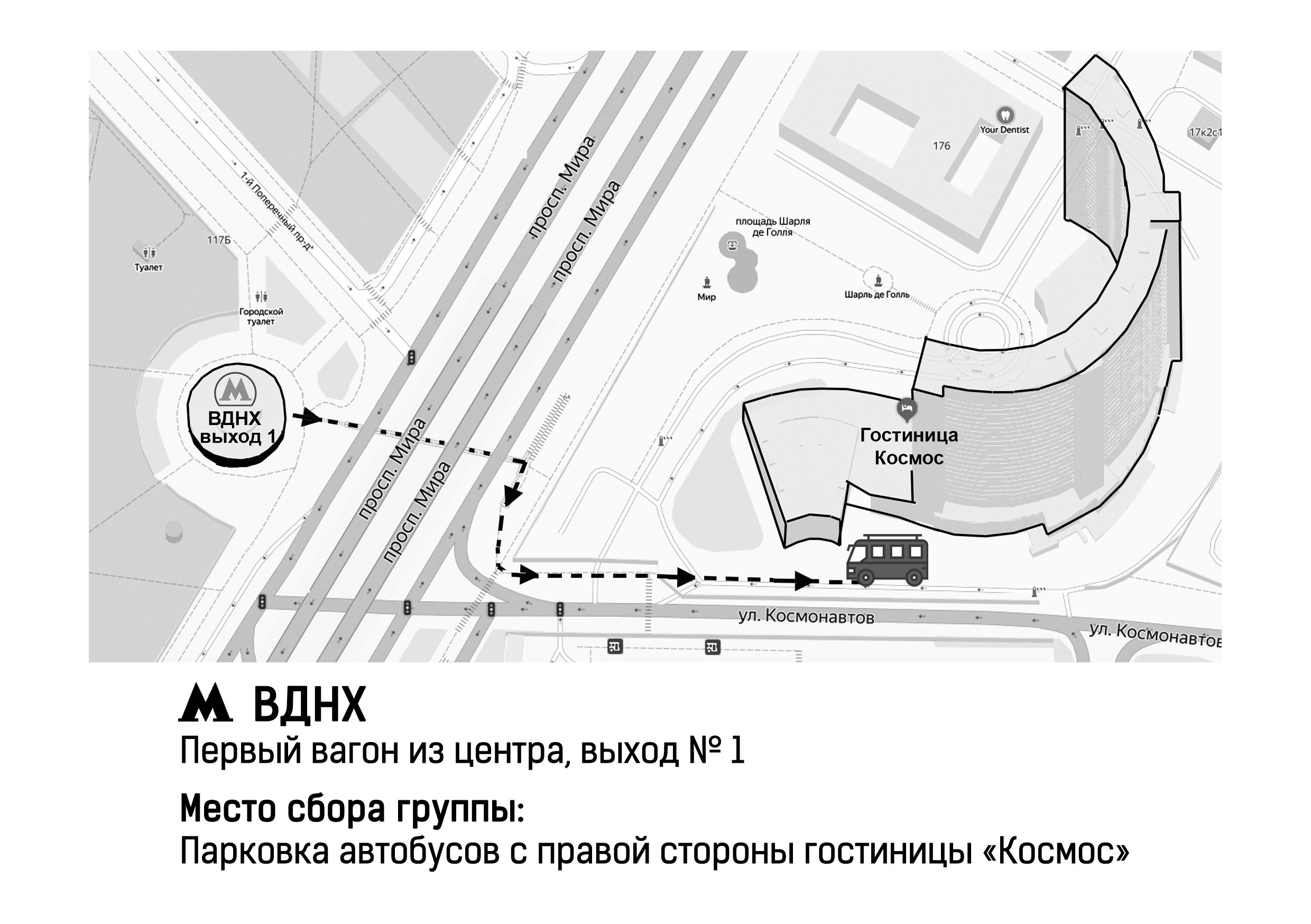 07:15 Сбор группы и встреча с гидом м. ВДНХ. Выход №1 (первый вагон из центра). Сбор группы на парковке автобусов с правой стороны гостиницы «Космос».