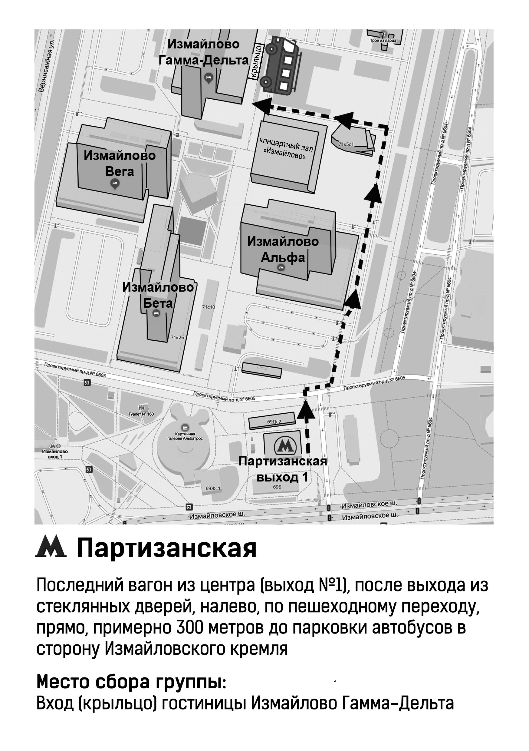 08:45 Сбор группы и встреча с гидом м. Партизанская (последний вагон из центра), на парковке автобусов около гостиницы «Гамма Дельта» со стороны концертного зала.